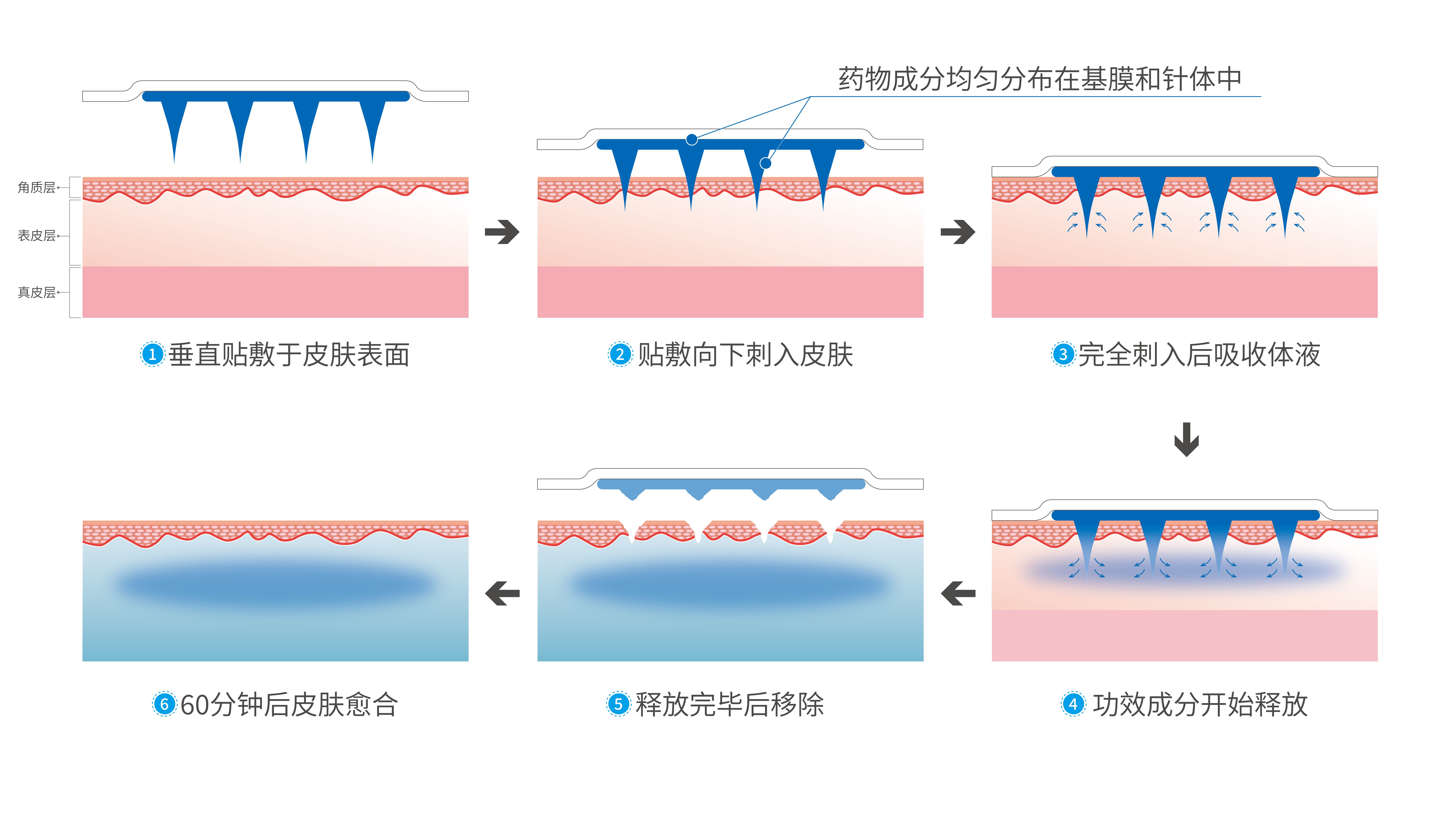 無(wú)痛微創(chuàng),依從性高 微針高度小于450微米,刺穿皮膚角質(zhì)層到達(dá)到表皮層吸收體液溶解釋放,不會(huì)觸及到真皮層的神經(jīng)末梢和毛細(xì)血管,患者不會(huì)感覺(jué)到疼痛也不會(huì)出血,無(wú)痛微創(chuàng)患者依從性高。