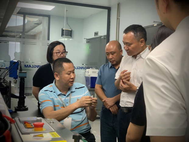 江林同時作為公司首席科學(xué)家?guī)ьI(lǐng)區(qū)政府領(lǐng)導(dǎo)們先后參觀了公司的總部和研發(fā)中心,就可溶解微針技術(shù)的原理和全球領(lǐng)域產(chǎn)業(yè)化進(jìn)展情況進(jìn)行了簡要介紹,同時邀請考察團(tuán)零距離觀摩體驗(yàn)青瀾生物的可溶解微針產(chǎn)品,直觀感受可溶解微針給藥技術(shù)的優(yōu)勢與創(chuàng)新性。羅開敏一行人對青瀾生物在該技術(shù)上取得的突破性成果及公司的科研和產(chǎn)業(yè)化實(shí)力給予了高度評價。