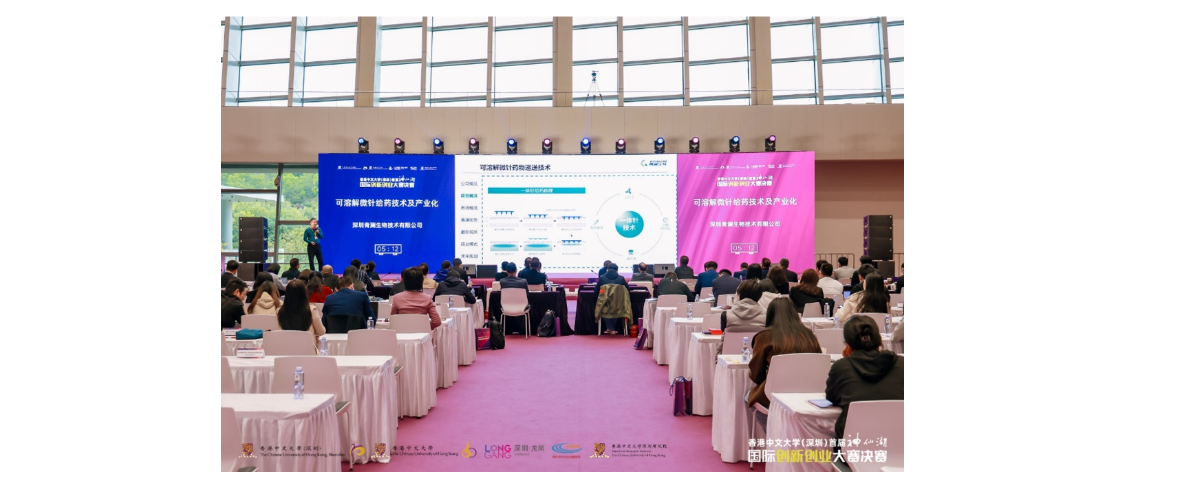 決賽伊始,香港中文大學(深圳)校長、中國工程院院士徐揚生教授發(fā)表了開場致辭。他表示,本次創(chuàng)新創(chuàng)業(yè)大賽是一次盛會,在港中大(深圳)建校十周年之際舉辦具有重要意義。希望以此次大賽為契機來搭建一個大灣區(qū)校企合作平臺,吸引越來越多的優(yōu)秀創(chuàng)新創(chuàng)業(yè)項目落地深圳、共同推動深圳創(chuàng)新發(fā)展。本次決賽邀請了包括頂尖投資機構、行業(yè)龍頭企業(yè)等在內(nèi)的10位專家評委和20位嘉賓評委組成的強大評委陣容,經(jīng)過6個多小時的激烈角逐,共評出創(chuàng)客組和企業(yè)組各1名一等獎、1名二等獎和1名三等獎,其余均獲得優(yōu)秀獎。決賽采取“7+5”模式,即每個項目7分鐘路演+5分鐘評委提問。決賽過程中,青瀾生物總經(jīng)理江林博士從技術產(chǎn)品、商業(yè)模式及實施方案、行業(yè)市場、公司團隊、財務分析等多個方面,對“可溶解微針給藥技術及產(chǎn)業(yè)化項目”進行了全面而深入的演說與分享。因為本次比賽不區(qū)分行業(yè)賽道,因此評委團構成人數(shù)眾多,每個賽道均由五六名專業(yè)評委組成,評委總人數(shù)超過30人。在評委溝通互動環(huán)節(jié),評委們對青瀾生物可溶解微針項目表現(xiàn)出非常高的參與積極性,從可溶解微針的技術難點、知識產(chǎn)權、適用的藥物種類、客戶開拓以及相較同行的優(yōu)勢等多方面進行提問,江林均針對性地進行了專業(yè)回復,現(xiàn)場互動氣氛專業(yè)、活躍、契合。本次比賽采取現(xiàn)場打分,比賽結束后答辯企業(yè)與組委會現(xiàn)場簽字確認成績,確保了比賽的公平公正。隨著所有項目的路演結束,大賽進入了激動人心的公布成績階段,青瀾生物表現(xiàn)驚艷,在所有參賽企業(yè)中取得第二名的好成績,獲得了二等獎。最后大賽進入了激動人心的頒獎典禮,深圳市中小企業(yè)服務局副局長兼綜合處處長胡小劍為青瀾生物頒發(fā)獎項,本屆大賽圓滿落幕。