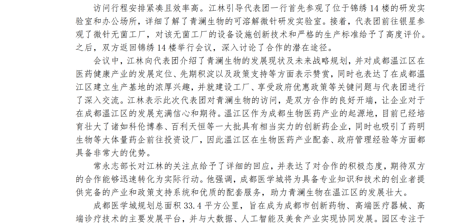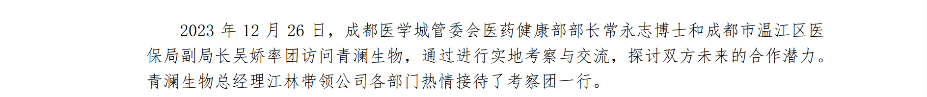 成都醫(yī)學(xué)城管委會(huì)和溫江區(qū)醫(yī)保局領(lǐng)導(dǎo)訪問青瀾生物,探討深度合作前景
